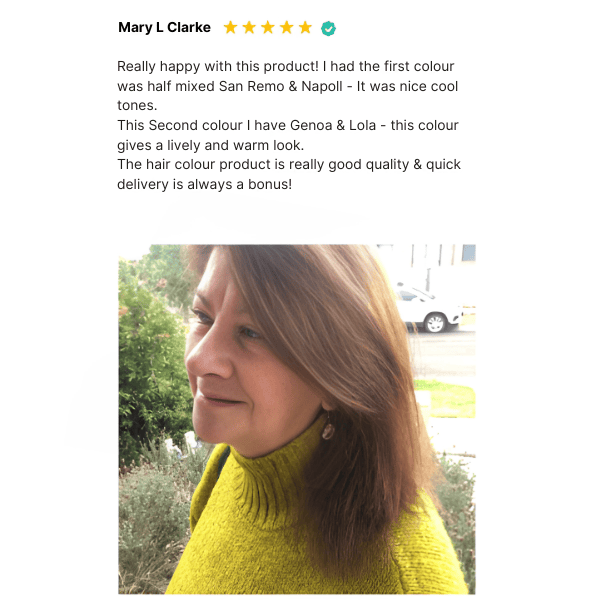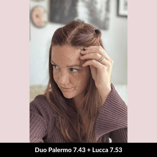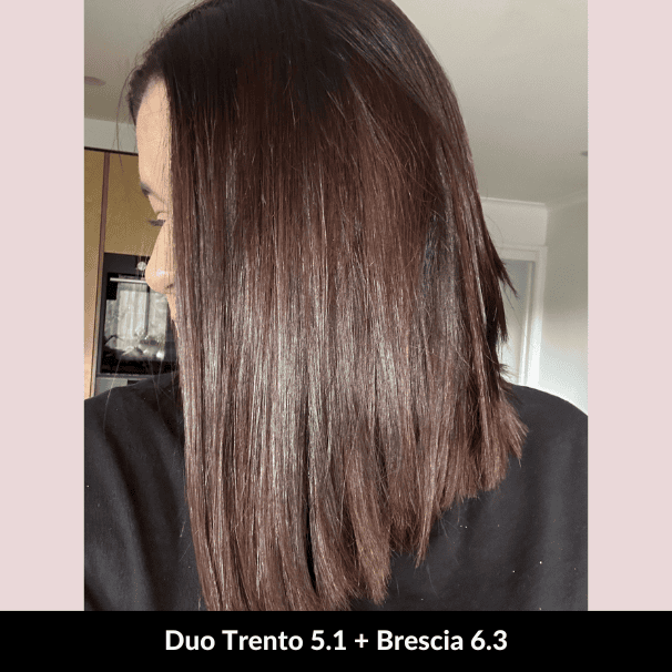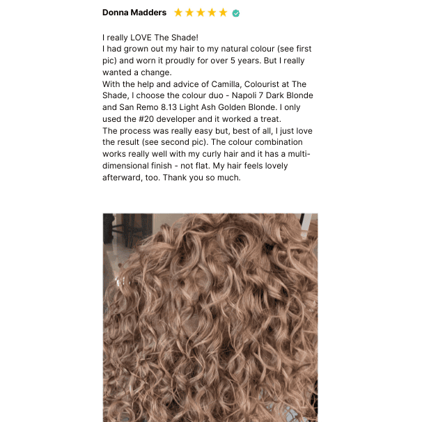 Camilla suggested a duo of Lucca Chocolate Blonde 7.53 and Torino Golden Blonde 8.3 for my dark brown hair. The duo of colours was easy to prepare and apply and the shampoo and conditioner lovely to use. Overall I am very happy with the results!