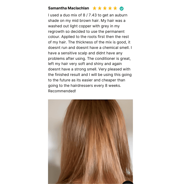 To achieve this colour result, you will initially need two separate colours, which you can order in a Duo Colour Kit. Squeeze your primary colour into your tint bowl and then use a tablespoon measure to remove one level tablespoon of colour. Add one level tablespoon of your second colour, and mix well. This blend creates a beautifully customised blend with a subtle secondary tones such as her gorgeous soft auburn.