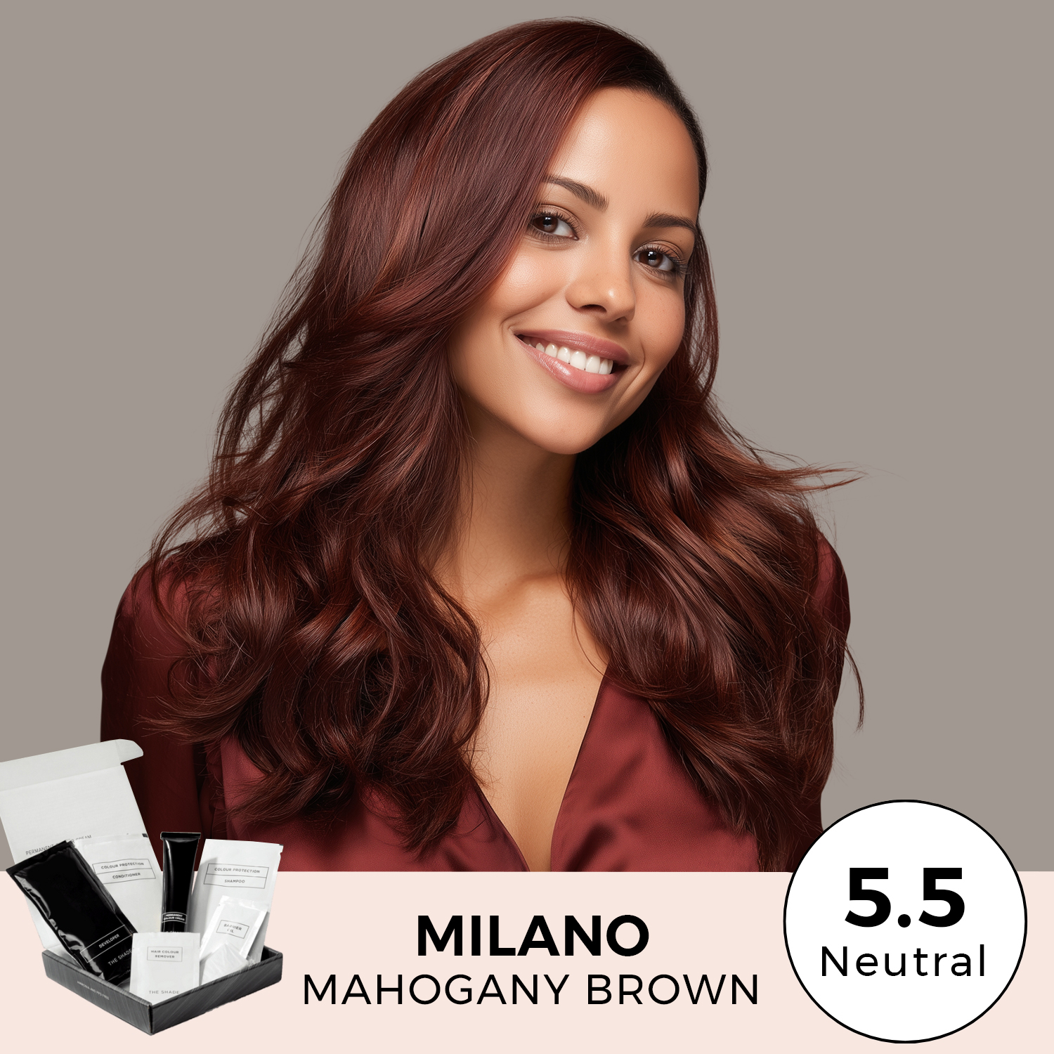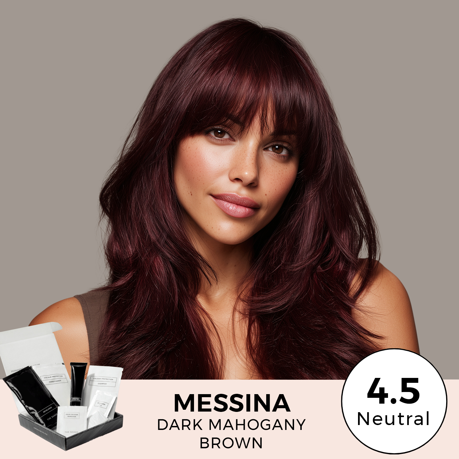Messina has a dark brown base blended with red and wine tones to give a rich mahogany colour result. The merlot wine finish is based on the dark reddish brown with a smaller amount of violet added to the colour base, giving a vibrant glossy twist on a classic brunette base.