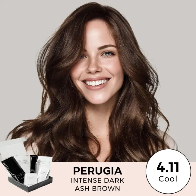 Perugia is a cool-toned dark brown shade designed to have very strong neutralizing properties against unwanted warm, brassy (red or orange) undertones, resulting in a deep, cool dark brown finish.