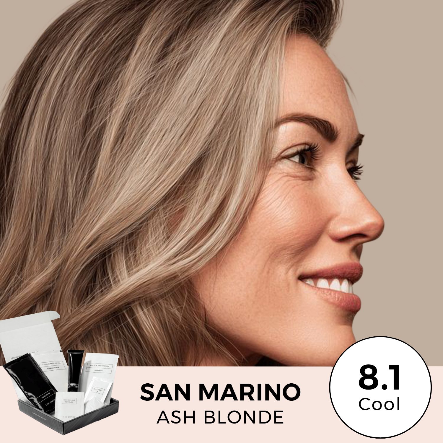San Marino 8.1 has a medium-blonde base with cool smokey mushroom ash tones which will reduce unwanted warmth. Please note this colour has a mushroom ash finish which does have a bit of depth.